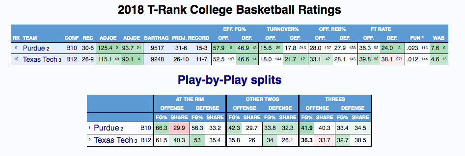Texas Tech shooting: .364 from three (99th) on 33.7 attempts per 100 (273rd), .514 from two (114th), .696 from the line (253rd). That is ... not going to win you games against a team that doesn't turn the ball over much. And sure enough, when we go to hoop-math, we see that Texas Tech has an eFG of .642 in transition, but just .502 in their set offense. (For reference, Purdue is .589 and .576 respectively.) Keep the Red Raiders in their half-court offense and they are going to struggle pretty much everywhere.