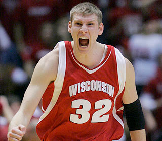 Brian Butch, the whitest kid in perhaps the whitest state in America, banked in a craptastic three-pointer to give the Wisco Badgers a win last night in Bloomington. That now makes the Badgers 10-2 in conference play, just one game behind Purdue. Well, two, really, when you consider that we swept them. (Sorry, it just feels good to say that.)