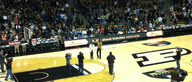 JJ was honored at halftime for his great career in God's Country...and although his number had already been added to the rafters, it was the night when he was formally recognized. He was walking around in the concourse before the game like a normal, anonymous 6'11" guy prior to his Mom escorting him onto Keady court.