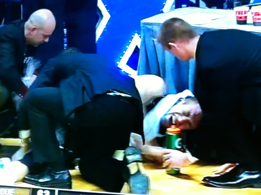 First, let's just hope Rob is okay. It appears that he was suffering from serious leg cramps and nothing knee-related. We don't know that for certain, obviously, but it was pretty clear they were working on areas above and below his knee. In truth, Rob probably shouldn't have come back into the game so quickly after his first cramping -- he must have been dehydrated, which isn't something you can fix quickly. But he knew his team desperately needed him and Coach Painter allowed him to return. One of many miscalculations by Coach in this one, which is not something we often say.