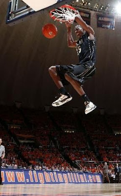 JJ truly was putting together his NBA highlight reel in this game. He showed all parts of his game (aside from his new three-point prowess), with soaring dunks, soft-touch fall-aways, athletic blocks, crisp passing, intuitive movement without the ball and aggressive rebounding. On that last one, Purdue outrebounded the Illini by 12, which makes the game so much easier to win when you're not shooting well.