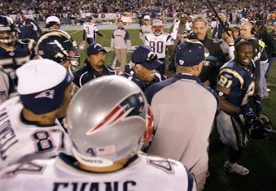 Has any game had so many reasons to root against both teams? I mean, the Chargers have always been likable in my memory. Dan Fouts back in the '80s, Flipper Anderson catching passes, warm weather, cool unis, etc. What's not to like? Then in the '90s they had a mini-resurgence, reaching the Super Bowl in 1994 with Stan the man Humphries at quarterback and Natrone Means rushing. It was a likable team and always has been. Now they've got the aforementioned jackass Merriman, the frat boy-level obnoxious Rivers and LT, who I used to kind of like but now I realize is a whiner. When things don't go his way he yells at teammates and coaches and, as I said, got pissed at the Pats last year.
