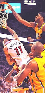 The Pacers closed out the Heat last night on the shoulders of Hibbert and George's big games. Of course, the Heat really have no one who can match up with Hibbert, so that helps both he and George- James probably should be guarding George all the time, but since they need Bron's strength and size underneath to help, George will have Battier or someone else on him regularly. But on one play yesterday, James was guarding him and got flat-out beaten. The end result was the Birdman getting embarrassed, which was nice to watch (pictured).