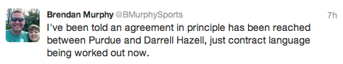 But at 8:31, things changed again...as it became official. CBS' Bruce Feldman tweeted that Hazell's deal was done and he'd lead the Boilermakers: