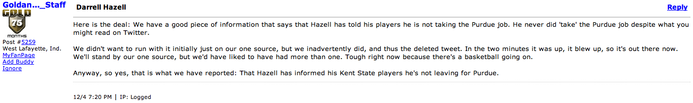 In the six o'clock hour GBI warned Purdue fans to not completely believe everything that was on Twitter- fair point. But this was after they had tweeted that Hazell was coming to Purdue...then, at 7:20, they published a retraction on their site that spread quickly and people began filling in the blanks in the wake of Bielema's move away from Wisconsin and to Arkansas.