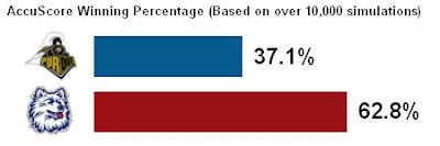 In the eyes of the media, the unstoppable juggernaut that is UConn basketball cannot be stopped by the lowly hand maiden Purdue Boilermakers. Well, that's not what the computers say. Sure, they're still underdogs, but with the average score after 10,000 simulations being 72 - 67 with UConn winning, it's not exactly the defenseless going against the jack booted oppressors here.