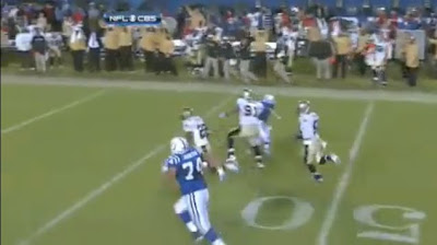 If you're looking for it, it's not hard to see at all. Peyton immediately knows it's a pick and starts making a path to intercept Porter, who spent most of the run changing hands, apparently because he couldn't decide which hand to use to showboat with. (To Mrs. Money's everlasting credit, during the replay she says, "Stop switching hands!" And no, she wasn't referring to me. Pervs.)