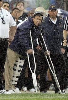 The 53-year-old Weis injured his left knee on Sept. 13 when defensive end John Ryan, who is 6-foot-5 and 264 pounds, was blocked into the coach during the Michigan game. Doctors told Weis the damage was so severe it appeared that he had been in a car crash. In December, he had his right knee replaced because of severe deterioration of the bone.