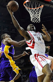 Boilerdowd beat me to it below, but how about Carl Landry's play for the Rockets? The Rockets won Game 6 here in H-town last night, forcing Game 7 on Sunday in Hollyweird. I looked a bit online but was unable to find photographic evidence of his drive down the lane and tomahawk jam that sort of was the exclamation point for the Rockets (though you can see it in the video highlights from ESPN in the game link). The Lakers had closed the gap but Carl simply said... no.