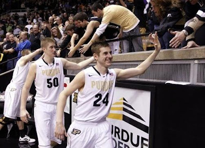 In this game, Purdue only had two guys get into double digits, with Barlow netting a tidy 14, including 5/7 from the line, and Ryne Smith tallying 12, all from beyond the arc on 80% three-point shooting (4/5). Ryne also had four rebounds, an assist and two steals. I also loved Smith's hustle in this game, as he gave up his body a number of times and played some strong help defense under the basket, committing a foul to stop a slam -- I like that.