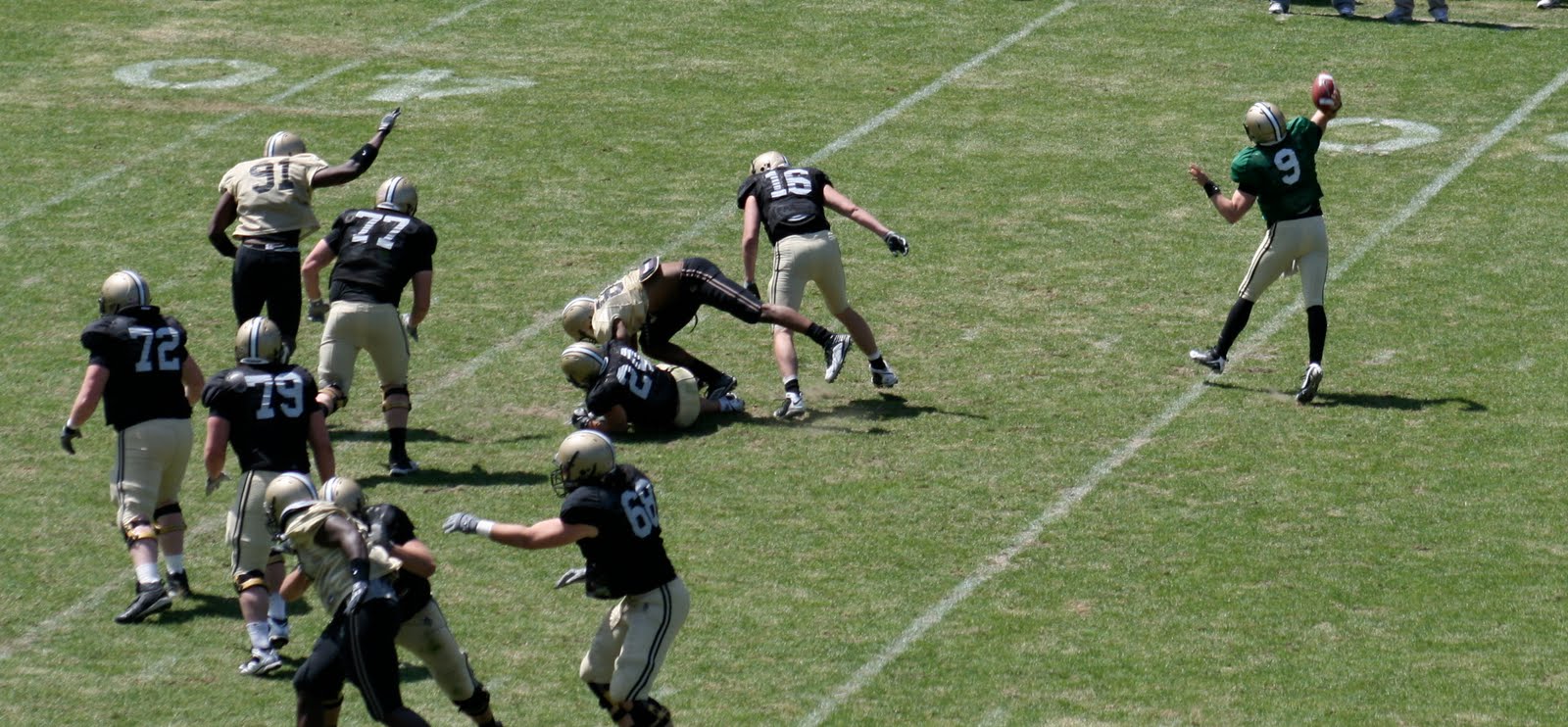 If you've ever played a football game with the neighborhood kids, you kinda know what he had to deal with today. One play, your pal from school is open, so you fire a pass at him, and he catches it. The next, you see one of your teammates break into the clearing, so you fire another...but this time, it's your little brother. He can't handle that pass, no matter where you put, so it goes through his hands. There was a lot of that. And there were a lot of guys playing who had simply never received passes from an arm like #9's.