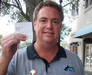 I think I'd put that in a safety-deposit box, wouldn't you? But no, this guy is taking the ticket to games with him. Uhhh, not wise, fella, not wise. Do you not think there are people in the parking lot of Tropicana Field who would beat you up for $25,000? I think there might be.