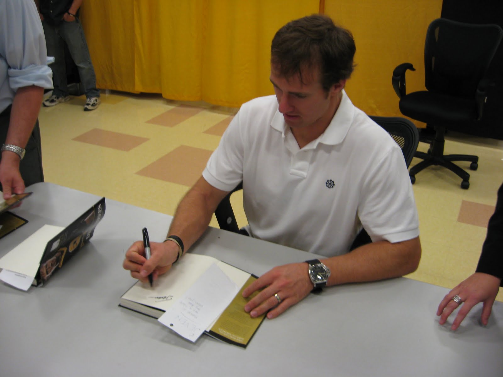 I used that line when I connected one of our readers, Jeff, a proud dad who lives in Indy, with Amanda, a PhD student at Purdue. Jeff wanted a book signed by Sir Brees and Amanda offered to go stand in line at 5:30 AM to get the book signed. Long story short, Jeff was hopeful that Drew would personalize it to his son. However, the rules were no personalization. Amanda used her womanly guile to get the autograph personalized anyway. Everyone goes home happy. Especially Amanda, who is probably taking a nap right now.