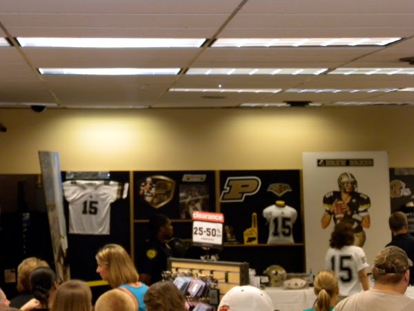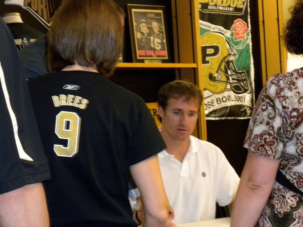 The man of the hour finally arrived. He was about 5 minutes fashionably late, and was greeted with some hearty cheers and a big round of applause, even though 90% of the people present at the time couldn’t even see him, so their happiness was based on faith alone. The line moved quickly, he must be as quick signing things as he is finding Reggie Bush for the TD. Speed-signing was of the essence because Follett’s had distributed boarding passes to the masses which extended to at least an “L” group. Margaret finally approached the table with 3 books in hand ready to be signed. As a starstruck 20 year old, there wasn’t much she could think of to say, but her mom was ready with camera in hand to take candid paparazzi photographs. Then, Mom interjected with “Hey Margaret, tell him about the last time you saw him at Purdue!” That’s another story, but it involves Margaret running into him near the golf course and staring at him with her jaw dropped the entire time looking like a complete idiot wondering if what she had seen was real and afterwards calling her relatives in Louisiana to gloat that she had seen Breesus. Brees chuckled at the story, but we may never know if he was laughing with her or at her…