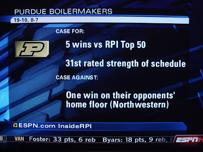 Now, on Monday night, Digger said the Boilers weren't in. Then Tuesday night, Digger said they would get in. Then tonight on Sportscenter when they were breaking it down, whoever the analyst on SC was said that Purdue had two bad losses, to Minnesota and to Indiana State.